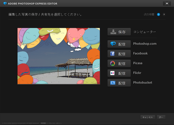 Photoshop Express EditorはPhotoshop.comのオンラインライブラリやFacebook、Picasa、Flickrなどで写真を共有することもできます。Photoshop Express Editorでオンラインライブラリを使用するにはPhotoshop.comへの無料登録が必要ですが、登録作業は名前とメールアドレスを登録するだけと手軽です。ソーシャルネットワークに画像を投稿すれば、Photoshop Express Editorで編集した画像を手軽に友達に披露し、すぐに楽しみを共有できるでしょう。